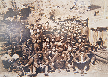 Mineros de la mina del Travanal, de antracitas de Noriega, en la Silva posan en el relevo. Hacia los años 40. Asociación Cultural Minera - Amigos de la Silva.